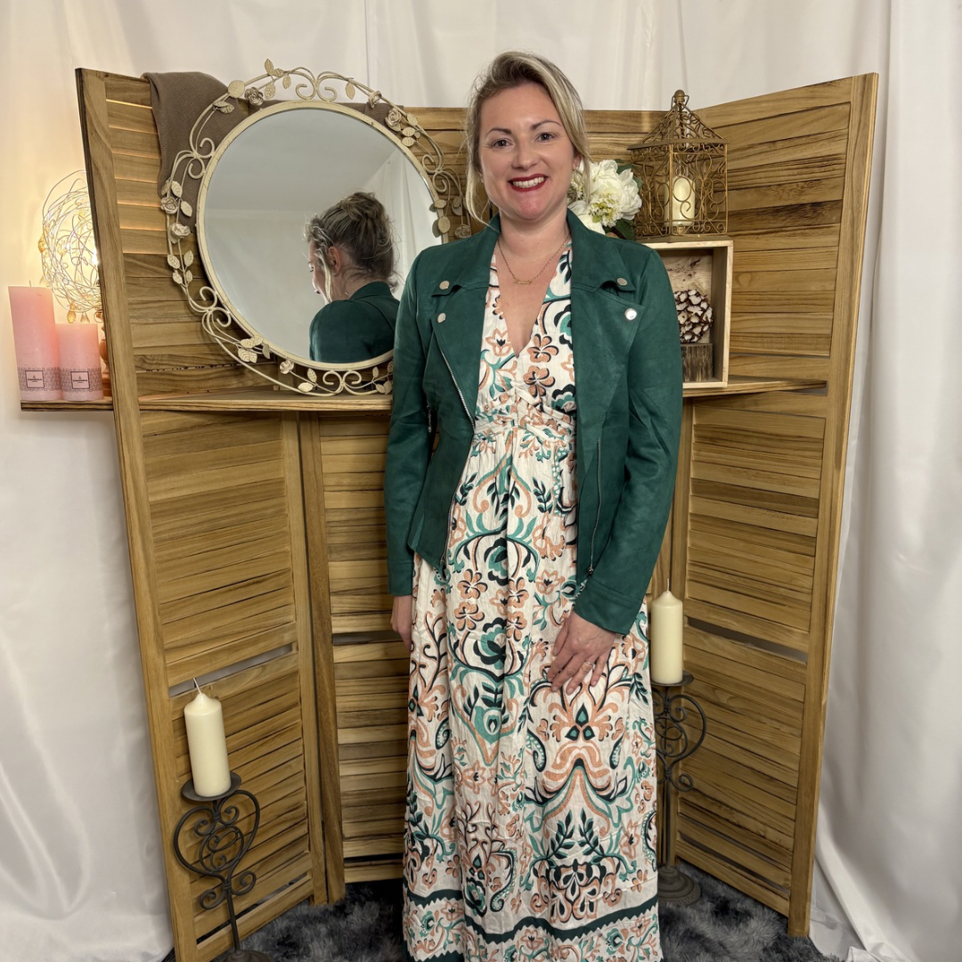 Emilie mesure 1m65 et porte habituellement la taille 40 (M/L pour se modèle)